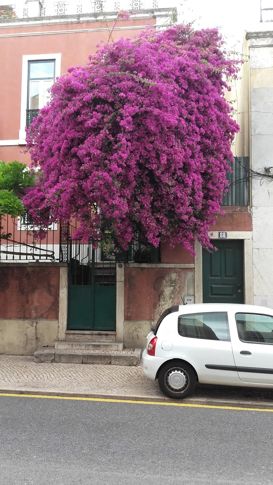 «Algum dia o poema será a buganvília / pendente deste muro da Calçada da Graça. / Produz uma semente que faz esquecer os jornais, o emprego e a família, / e além disso tudo atapeta o passeio alegrando quem passa.» Só que a buganvília da fotografia, se é que é mesmo buganvília, não atapeta o passeio da Calçada da Graça, mas o tejadilho de um automóvel estacionado no passeio da Calçada da Tapada, perto da Rua da Creche, caminho da Igreja de Alcântara, numa tarde de luz sob um pálio movente de nuvens esparsas. É tudo tão singular quando chamamos as buganvílias em nosso auxílio. «Mas antes desse dia há-de secar a buganvília», diz o poeta, e também há-de acabar a Calçada da Tapada, o automóvel, o muro e o gradeamento que cavalga o muro, digo eu. «Então, quando nada restar, nem o pó de um sorriso / que é o mais leve de tudo que se pode supor, / será esse o momento de o poema ser flor, / mas já não é preciso.»